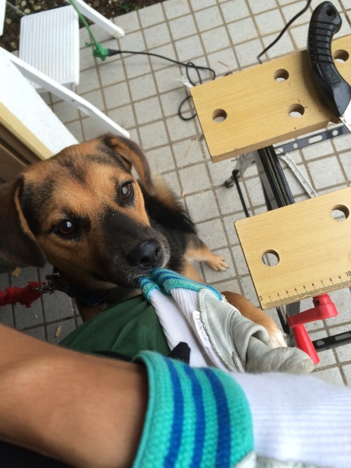 愛犬も「もうそろそろやめたら・・・」と作業を止めにきたのかな。
