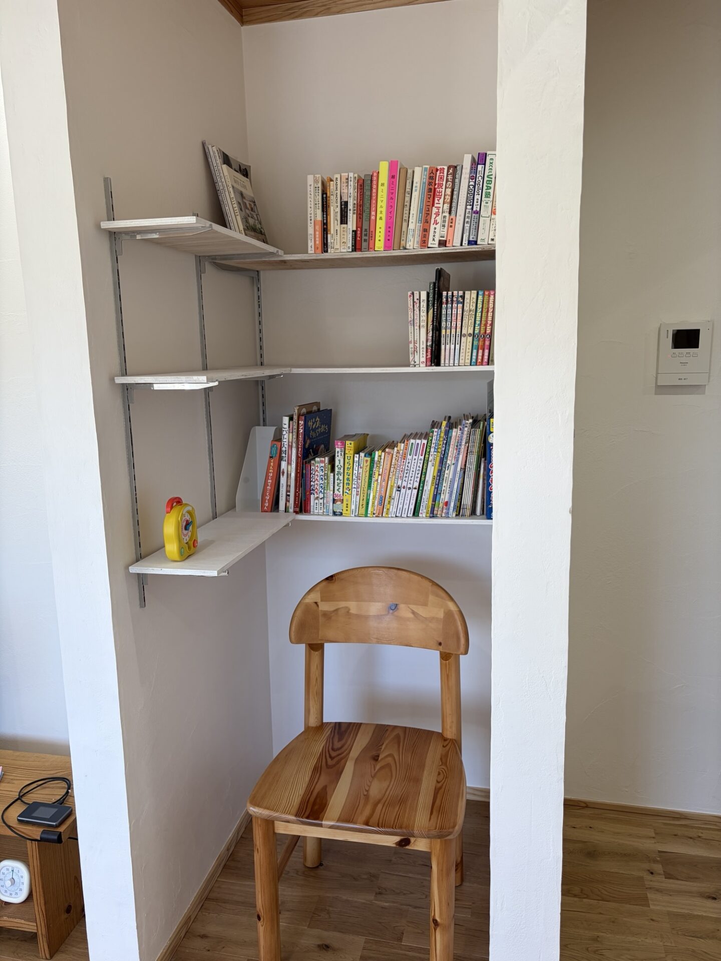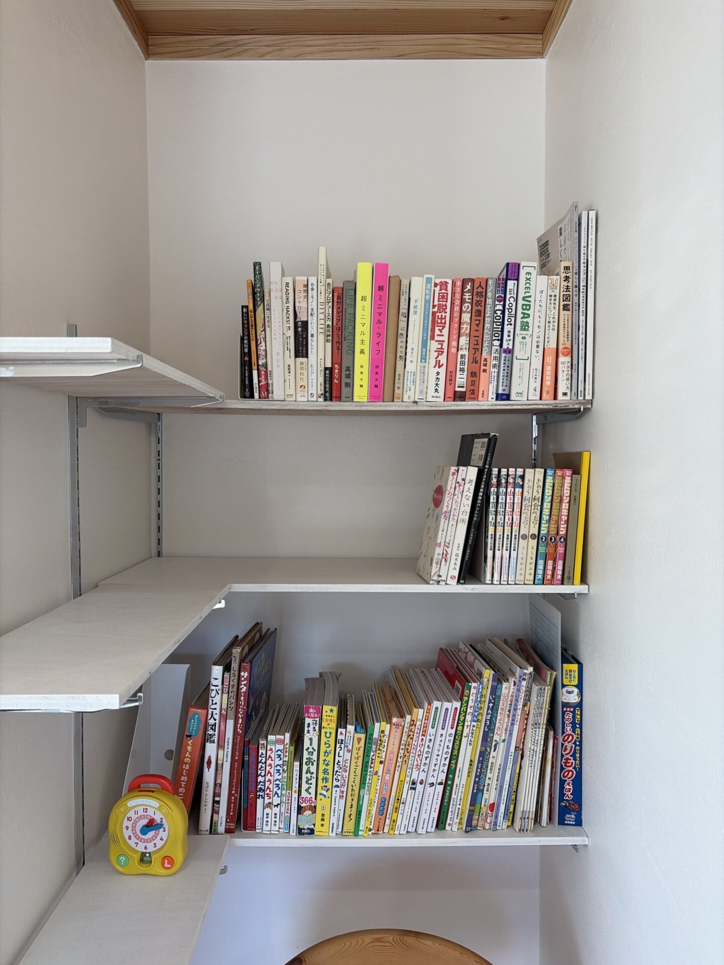 物を減らすという考えがあり、収納をそこまで多く作らないようにしていましたが、やはりもう少し必要と本棚にすることに。